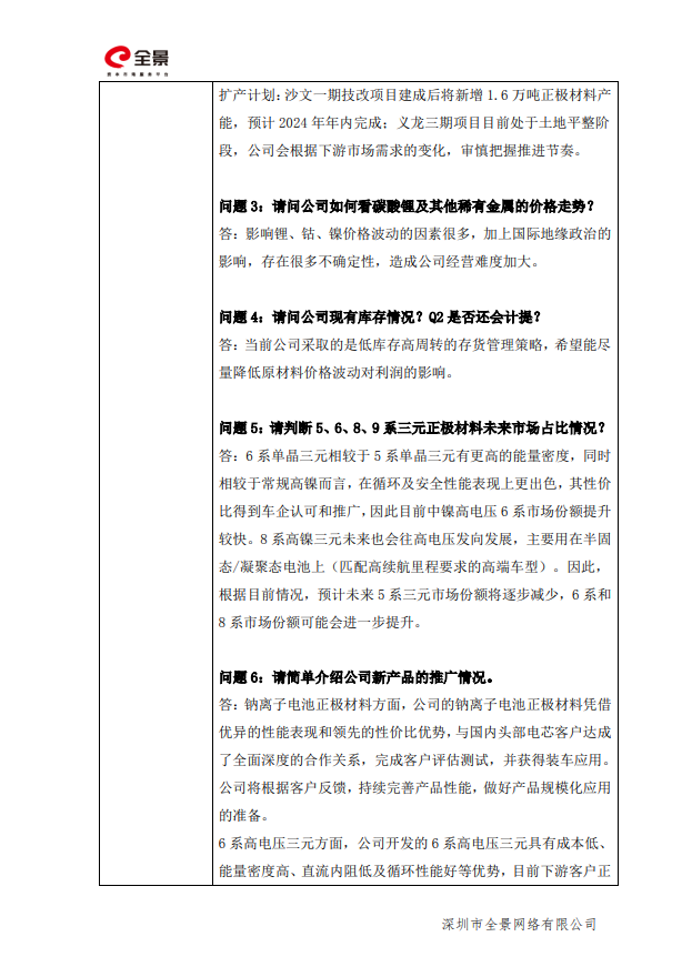 6系高电压三元方面,振华新材开发的6系高电压三元具有成本低、能量密度高、直流内阻低及循环性能好等优势,目前下游客户正深圳市全景网络有限公司在积极评估导入。