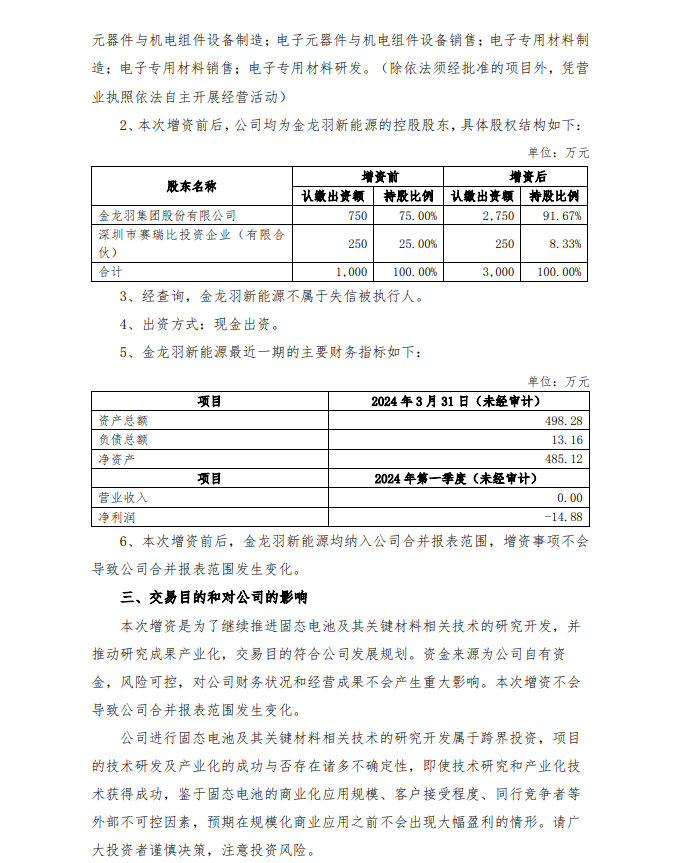 金龙羽表示,本次增资是为了继续推进固态电池及其关键材料相关技术的研究开发,并推动研究成果产业化,交易目的符合公司发展规划。资金来源为公司自有资金,风险可控,对公司财务状况和经营成果不会产生重大影响。本次增资不会导致公司合并报表范围发生变化。