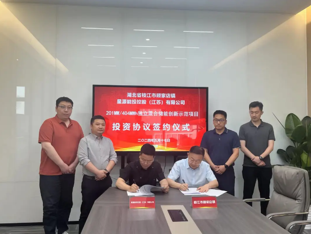2024年5月17日,星源能投与枝江市顾家店镇正式签署了合作协议,共同推进湖北省枝江市顾家店镇201MW/404MWh独立混合储能电站创新示范项目,助力构建“清洁低碳、安全高效”的现代能源产业体系。