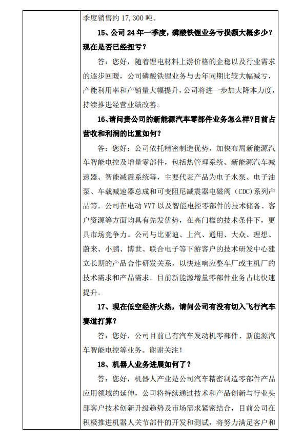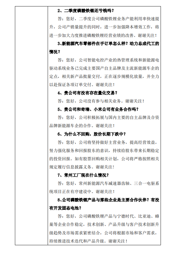 富临精工表示,二季度公司磷酸铁锂业务产能利用率快速提升,公司产销量提升的同时,进一步加强降本增效工作,将进一步加大力度推进磷酸铁锂经营业绩的改善。