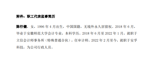 为保证监事会正常运作,安孚科技于近日组织召开职工大会,通过民主推选方式,选举陈行健女士为公司第五届监事会职工代表监事,与第五届监事会非职工代表监事一并组成公司第五届监事会,任期与第五届监事会一致。