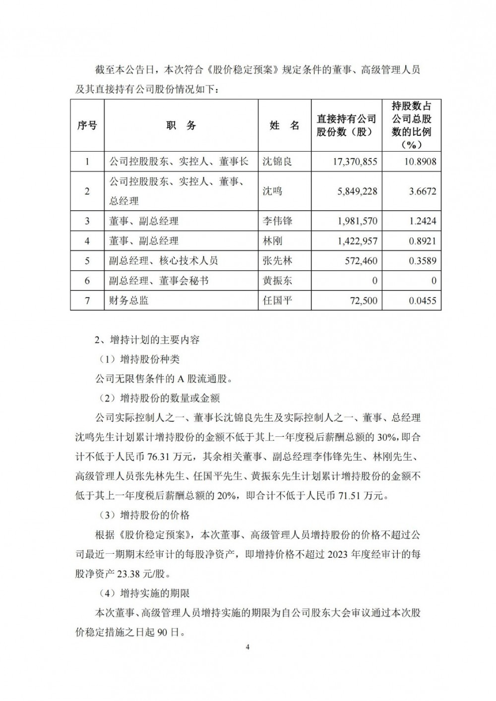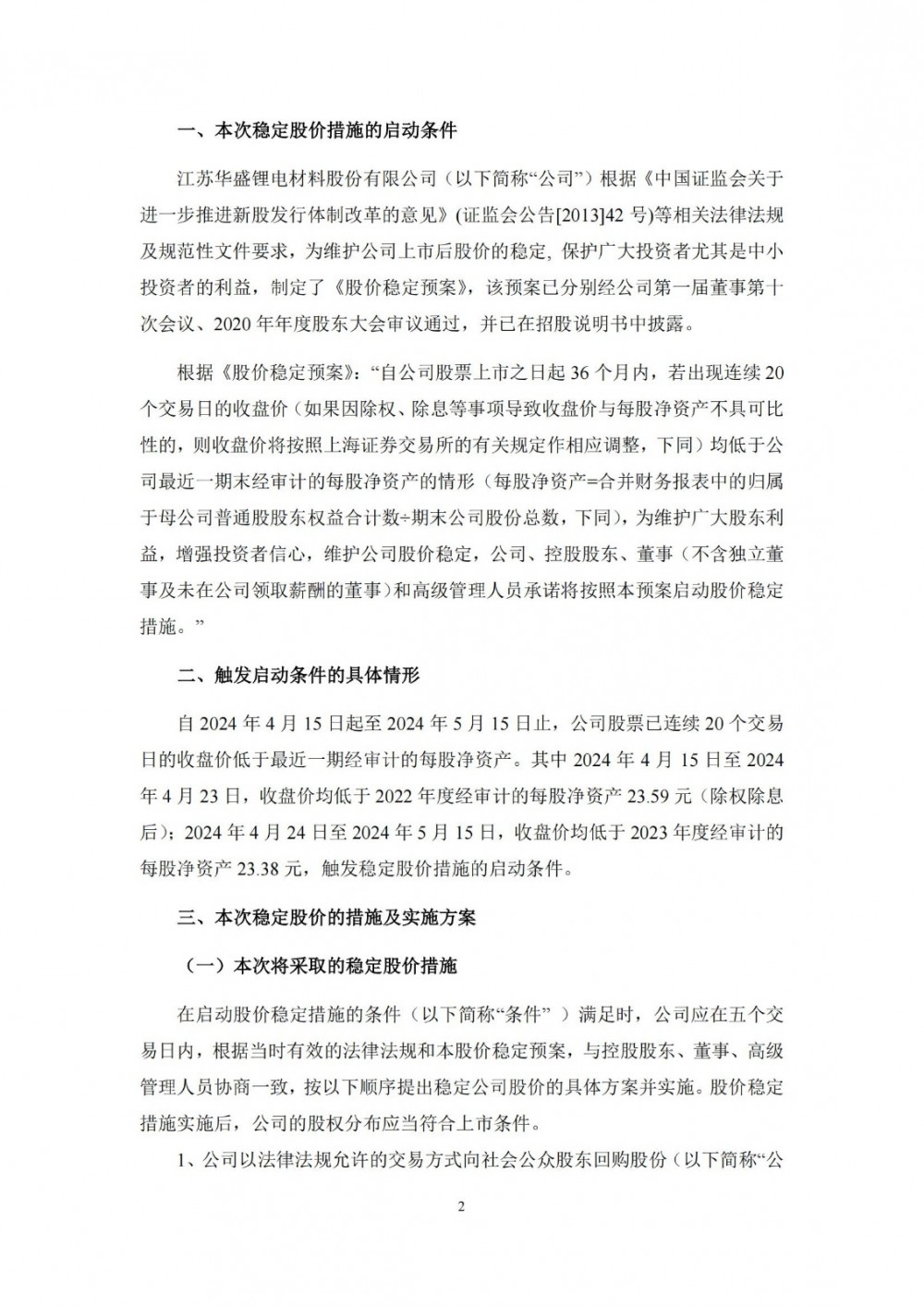 据储能界了解到,近日,华盛锂电发布公告称,根据《江苏华盛锂电材料股份有限公司关于公司首次公开发行股票并在科创板上市后三年内稳定股价的预案》,公司将采取由符合《股价稳定预案》规定条件的董事、高级管理人员增持公司股票的措施以稳定股价。本次符合《股价稳定预案》规定条件的董事、高级管理人员共计7人,公司实际控制人之一、董事长沈锦良及实际控制人之一、董事、总经理沈鸣计划累计增持股份的金额不低于其上一年度税后薪酬总额的30%,其余相关董事、高级管理人员计划累计增持股份的金额不低于其上一年度税后薪酬总额的20%。