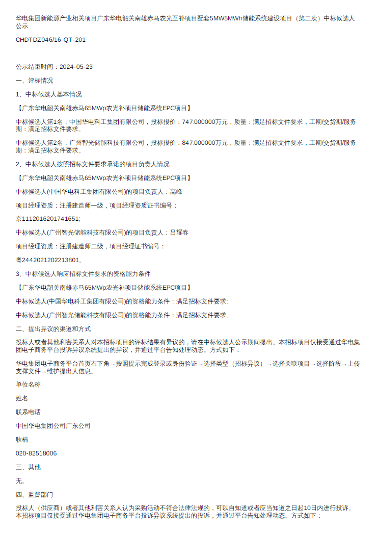 第一中标候选人为中国华电科工集团有限公司,中标报价747万元,折合单价1.494元/Wh;第二中标候选人为广州智光储能科技有限公司,中标报价847万元,折合单价1.694元/Wh。