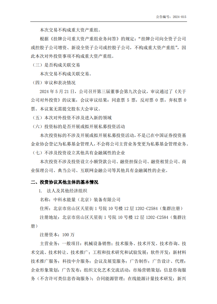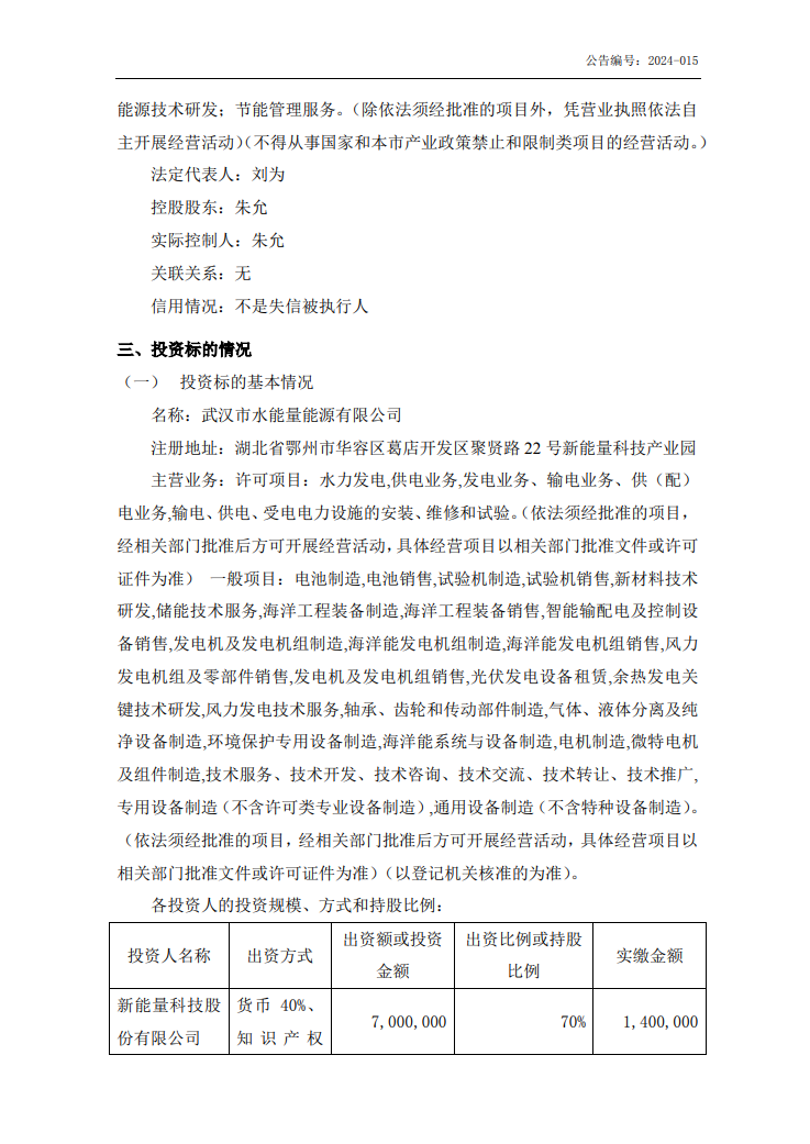 据储能界了解到,5月22日,新能量发布公告称,公司拟与中科水能量(北京)装备有限公司共同出资设立武汉市水能量能源有限公司(以登记机关核准的为准),注册资本为1000万元人民币,其中本公司出资700万元人民币, 占注册资本比例为70%;中科水能量(北京)装备有限公司出资300万元人民币,占注册资本比例为30%。