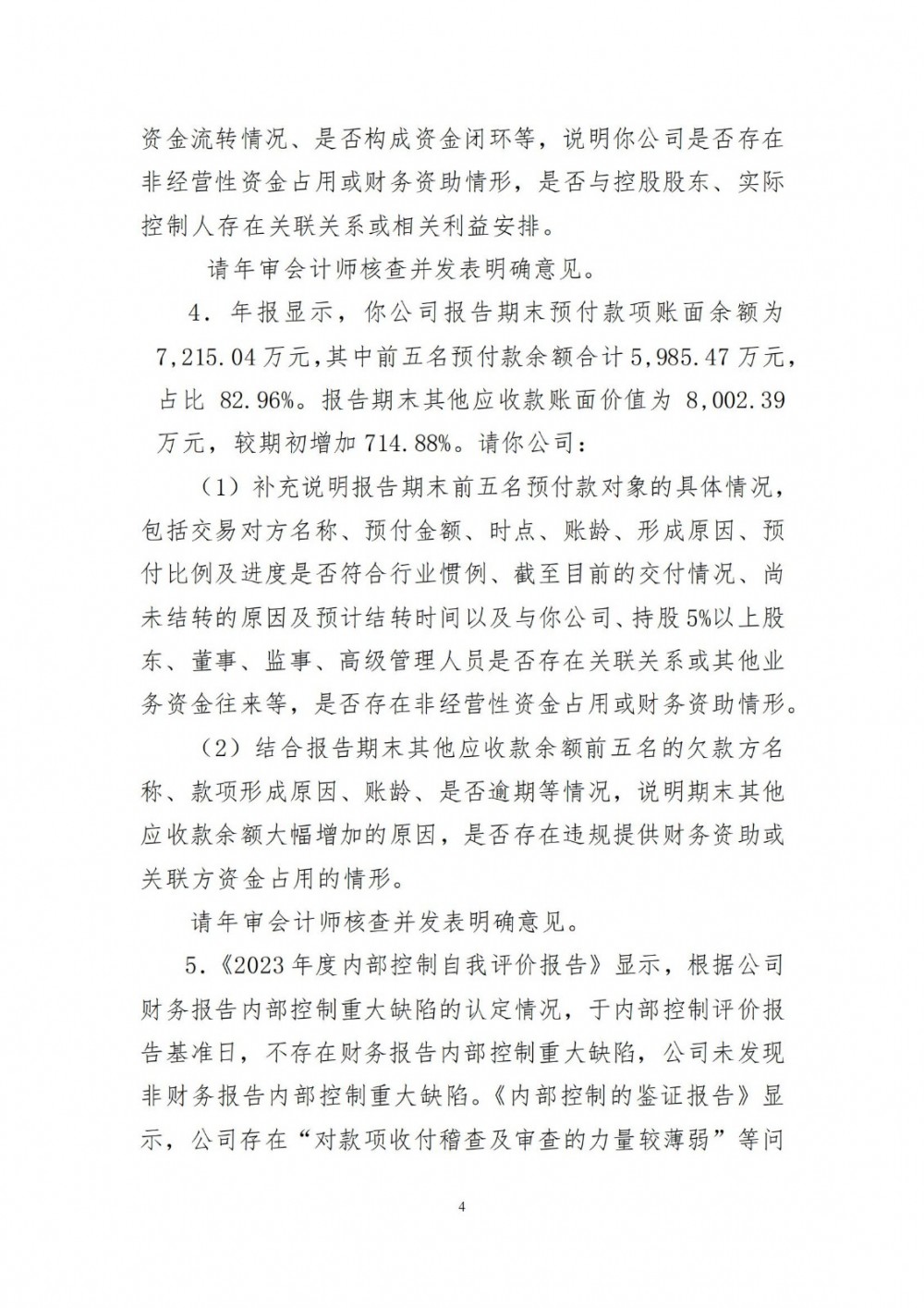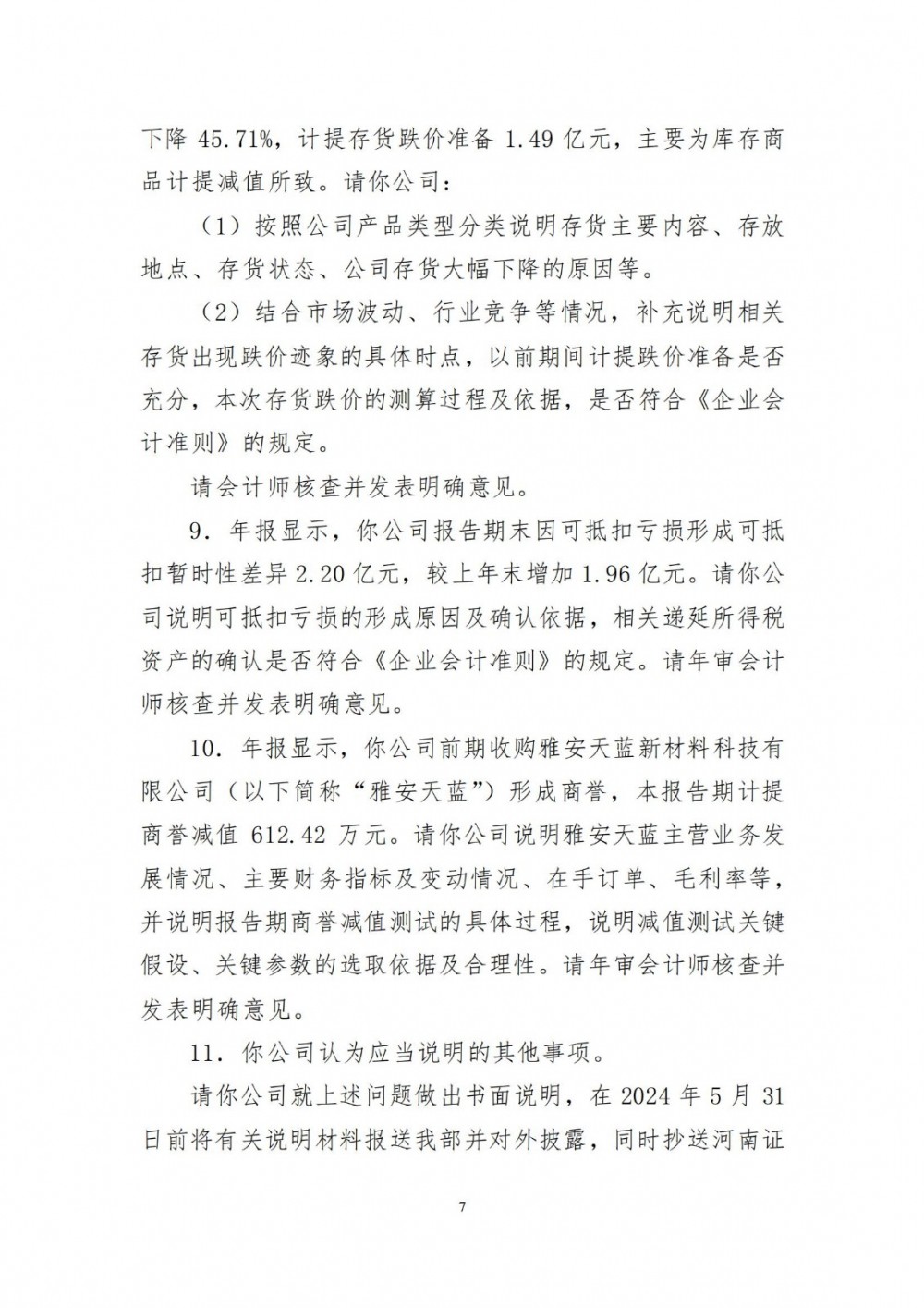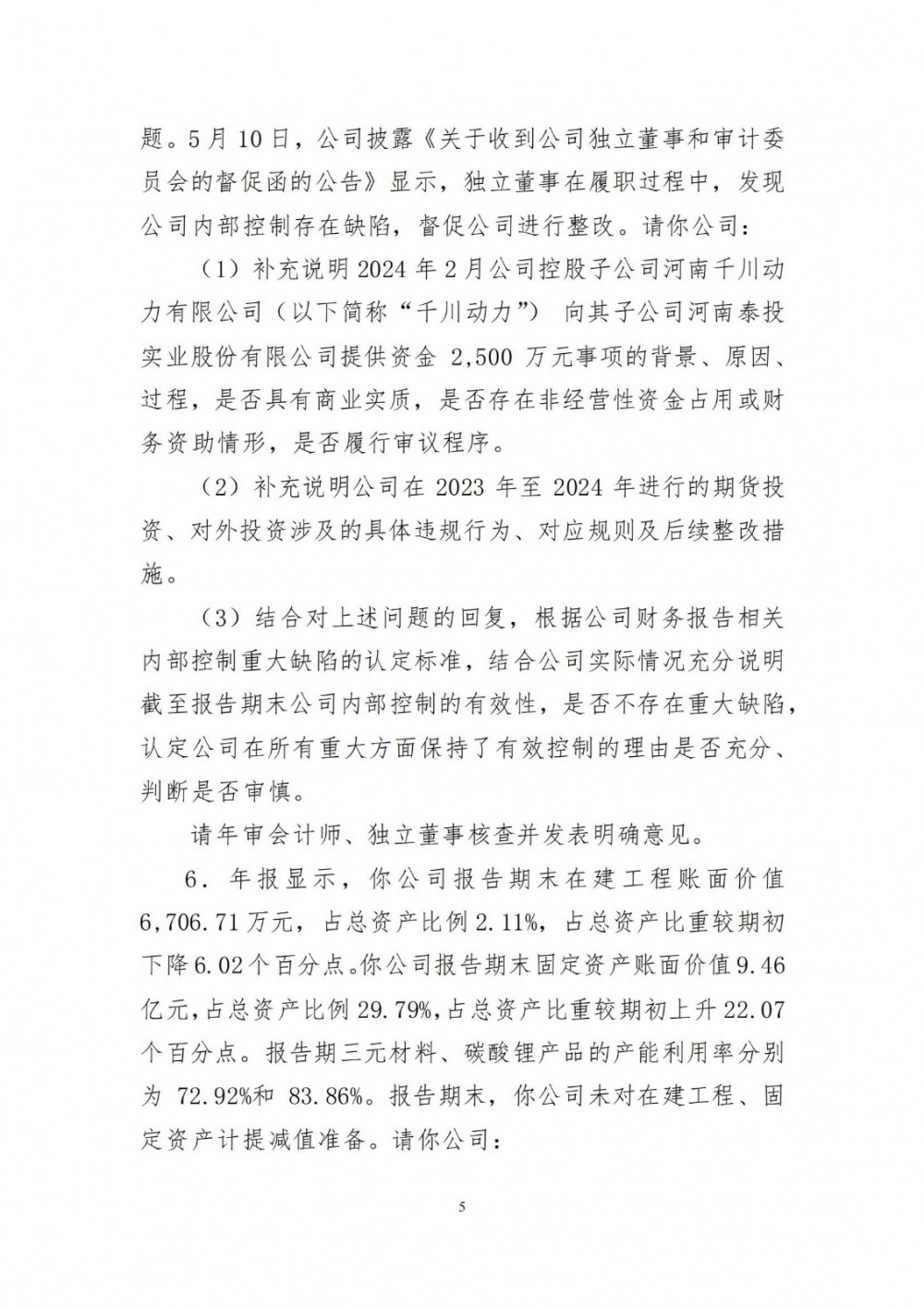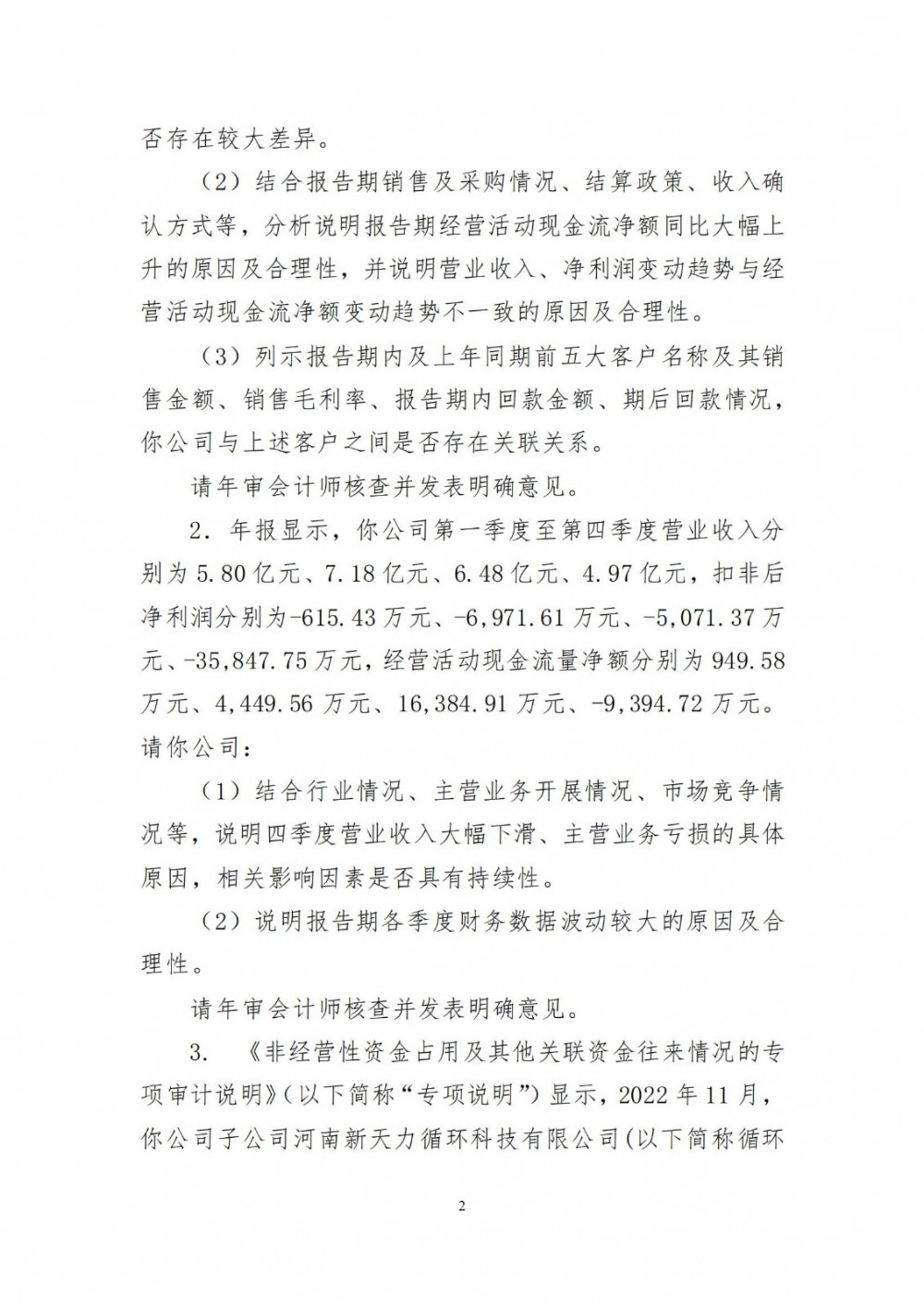 问询函针对“年报显示,你公司报告期实现营业收入24.43亿元,同比下降8.43%;实现归属于上市公司股东的净利润-5.03亿元,同比下降479.63%,实现归属于上市公司股东的扣除非经常性损益后的净利润-4.85亿元,同比下降522.39%,经营活动产生的现金流量净额1.24亿元,同比上升113.36%。三元材料及碳酸锂产品毛利率分别为-9.43%、2.84%,同比分别下降21.59个、11.14个百分点。”等情况,深交所提出包括“结合行业竞争情况、公司经营模式、报告期主营业务开展情况、各类原材料及产品价格变动、产能利用率、期间费用等情况,具体详细分析报告期业绩大幅下滑、主要产品毛利率大幅下滑的原因及合理性,与同行业可比公司是否存在较大差异”等要求。