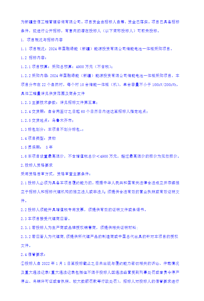 据储能界了解到,近日,2024年国融绿能(新疆)能源投资有限公司储能电池一体柜采购项目招标公告发布。