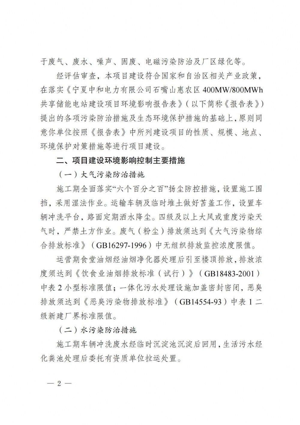 项目名称为宁夏中和电力有限公司石嘴山惠农区400MW/800MWh共享储能电站建设项目