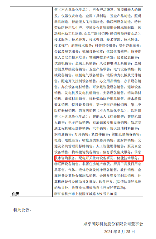 据储能界了解到,5月25日,咸亨国际发布公告披露,近日,公司已完成工商变更登记手续,并取得了浙江省市场监督管理局换发的《营业执照》。