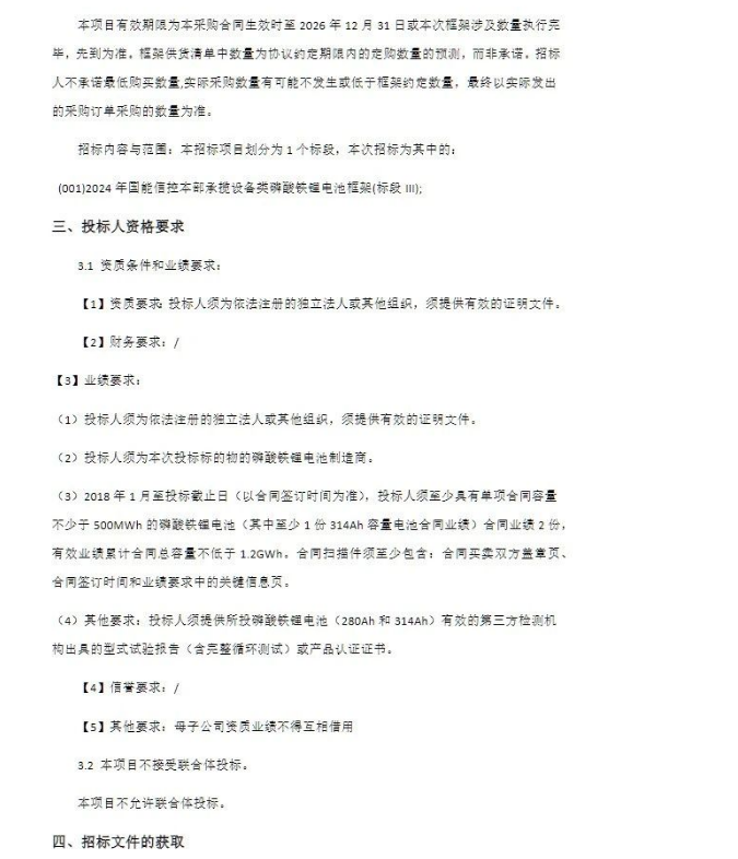 投标人须至少具有单项合同容量不少于500MWh的磷酸铁锂电池合同业绩2份(其中至少1份314Ah容量电池合同业绩),有效业绩累计合同总容量不低于1.2GWh,期限为2018年1月至投标截止日(以合同签订时间为准)
