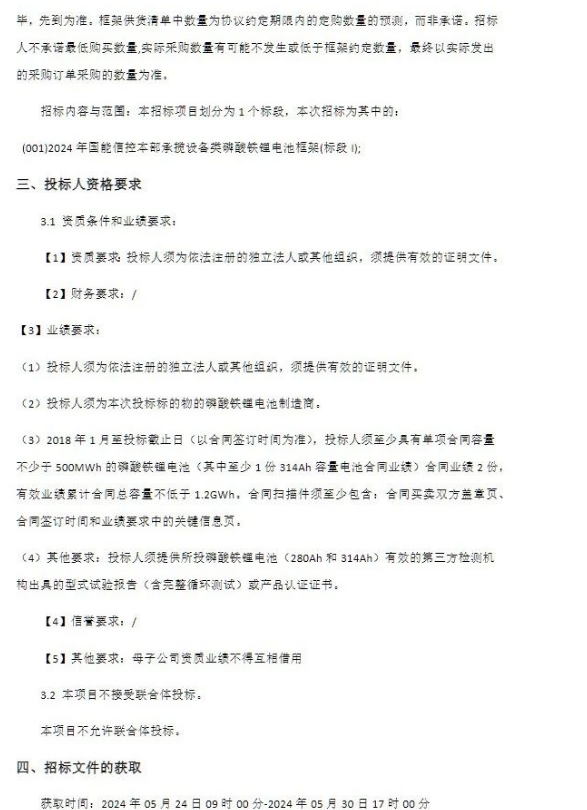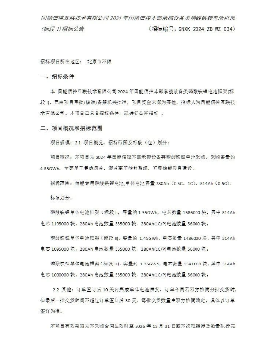 据悉,5月24日,《国能信控互联技术有限公司2024年国能信控本部承揽设备类磷酸铁锂电池框架(标段I-III)招标公告》发布。