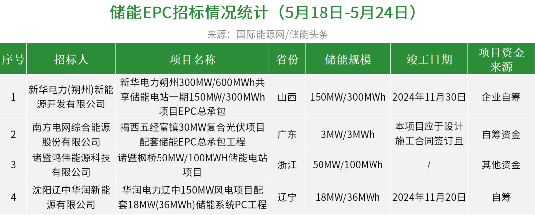 华电集团有1个项目开标,总规模为5MW/5MWh,华电科工集团、智光储能预中标;