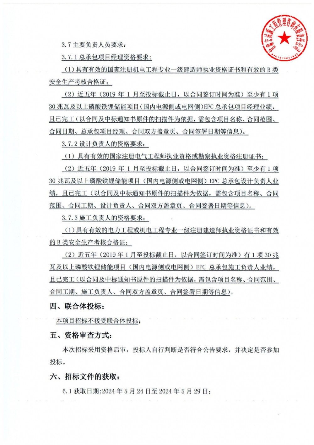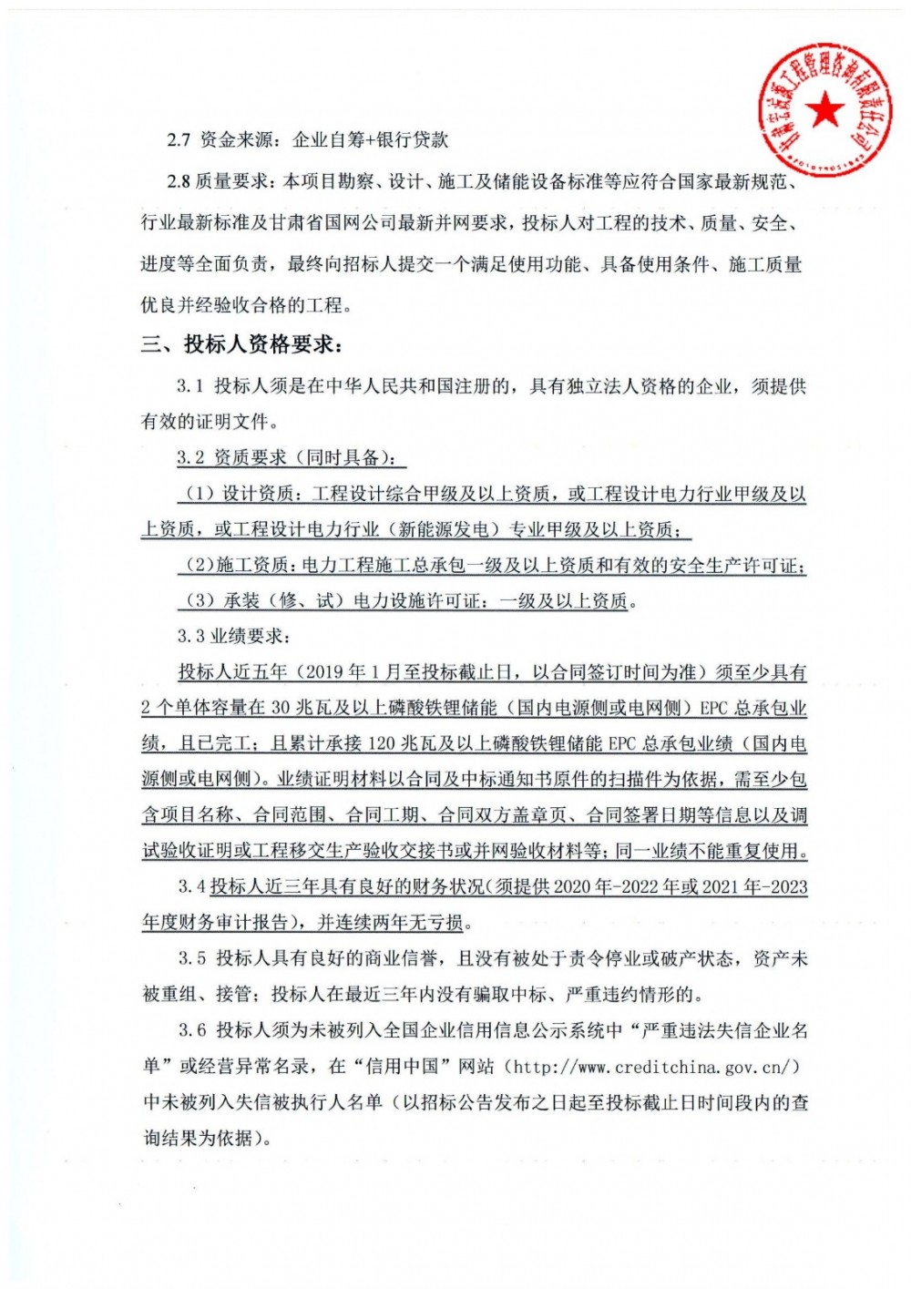 投标人近五年(2019年1月至投标截止日,以合同签订时间为准)须至少具有2个单体容量在30兆瓦及以上磷酸铁锂储能(国内电源侧或电网侧)EPC总承包业绩,且已完工;(国内电源侧或电网侧)。