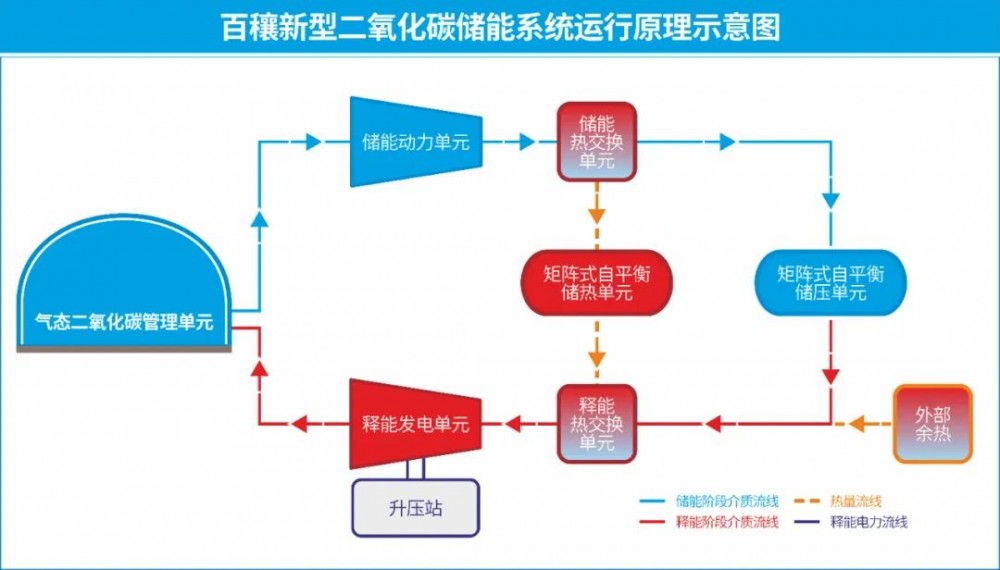 百穰新型二氧化碳储能系统基本原理是在用电低谷期,利用多余电力将常温常压的二氧化碳气体压缩为液体,并将压缩过程中产生的热能储存起来;在用电高峰期,利用存储的热能加热液态二氧化碳至气态,驱动透平发电。