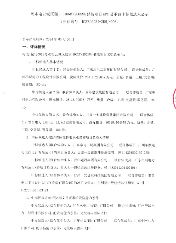 第一中标候选人为广东水电二局集团有限公司、广州华跃电力工程设计有限公司联合体,投标报价26110.212857万元,折合单价约为1.3055元/Wh;第二中标候选人为百年建设集团有限公司、广东中网电力有限公司联合体,投标报价26123.905981万元,折合单价约为1.306元/Wh;第三中标候选人为甘肃一安建设科技集团有限公司、聚合电力工程设计(北京)股份有限公司联合体,投标报价26129.104978万元,折合单价约为1.3065元/Wh。