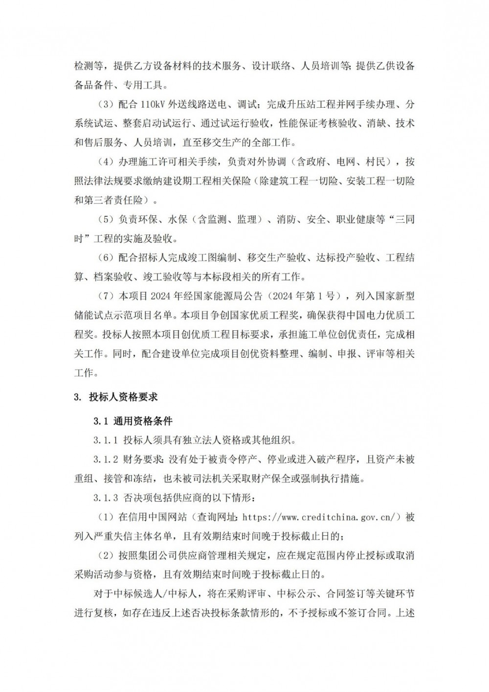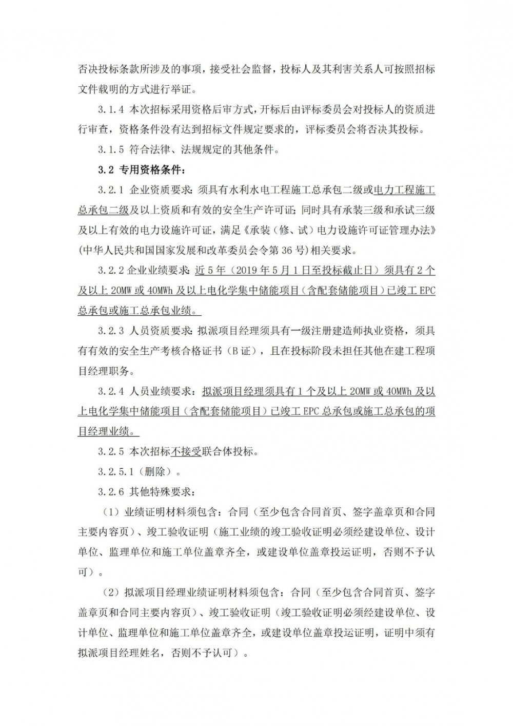 投标人近5年(2019年5月1日至投标截止日)须具有2个及以上20MW或40MWh及以上电化学集中储能项目(含配套储能项目)已竣工EPC总承包或施工总承包业绩。