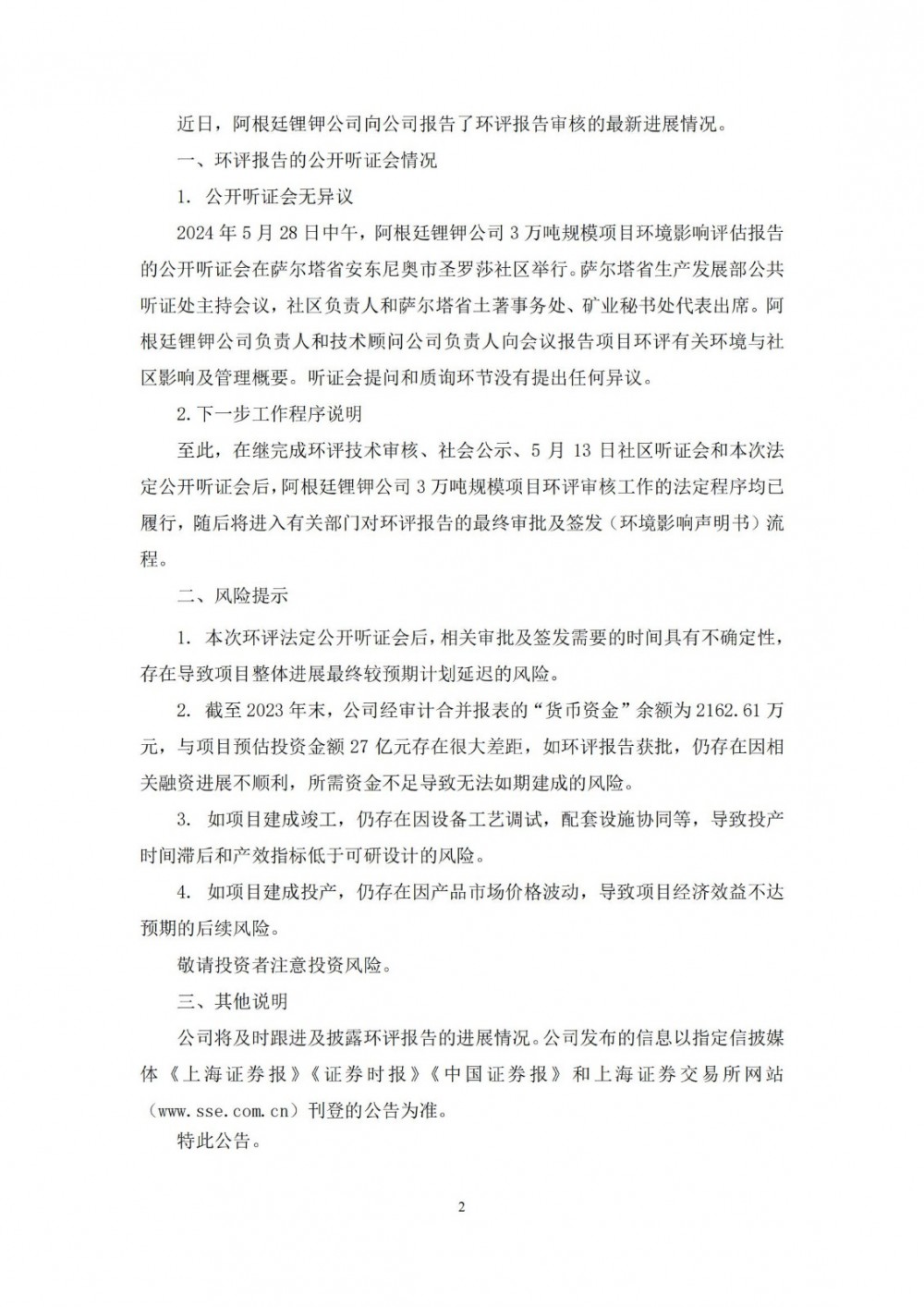 截至2023年末,西藏珠峰经审计合并报表的“货币资金”余额为2162.61万元,与项目预估投资金额27亿元存在很大差距,如环评报告获批,仍存在因相关融资进展不顺利,所需资金不足导致无法如期建成的风险。