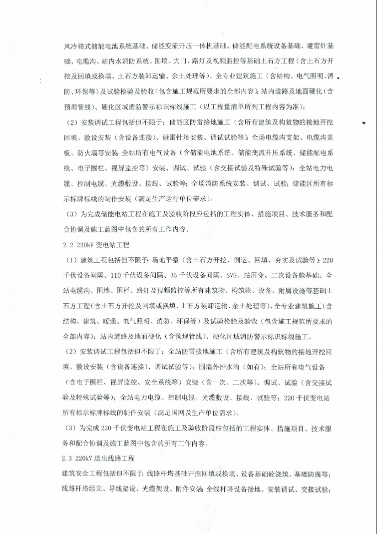 本项目PC总承包范围包括但不限于:16万千瓦/64万千瓦时储能电站、220 千伏汇集站、220千伏送出线路、对侧 220千伏扩建工程及10千伏电源线路工程的设备材料采购(储能设备由招标人提供)、催交、建筑、安装、调试、试验(含特殊性试验)、配合各项验收、配合竣工结算审计、质保期保修服务、接入并网及工程合规性手续办理等(以本次工程招标工程量清单为准)。
