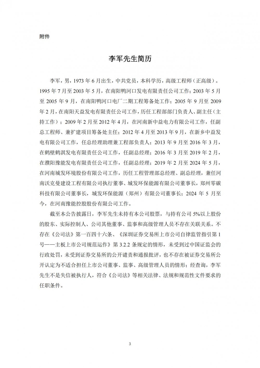 李军,男,1973年6月出生,中共党员,本科学历,高级工程师(正高级)。1995年7月至2003年5月,在南阳鸭河口发电有限责任公司工作;2003年5月至2005年9月,在南阳鸭河口电厂二期工程筹备处工作;2005年9月至2009年2月,在南阳天益发电有限责任公司工作,历任工程部部门负责人、副主任(主持工作);2009年2月至2012年4月,在河南新中益电力有限公司工作,任副总工程师、兼扩建项目筹备处主任;2012年4月至2013年9月,在新乡中益发电有限公司工作,任总经理助理兼工程部负责人;2013年9月至2016年3月,在鹤壁鹤淇发电有限责任公司工作,任副总经理;2016年3月至2019年2月,在濮阳豫能发电有限责任公司工作,任副总经理;2019年2月至2024年5月,在河南城发环境股份有限公司工作,历任工程管理部总经理、副总经理,兼任河南沃克曼建设工程有限公司执行董事、城发环保能源有限公司董事长,郑州零碳科技有限公司董事长,城发环保能源(郑州)有限公司董事长;2024年5月至今,在河南豫能控股股份有限公司工作。