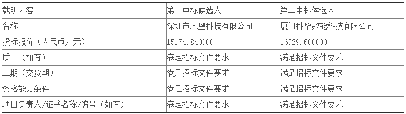 第一中标候选人为深圳市禾望科技有限公司,总报价15174.84万元,折合单价0.316元/W;第二中标候选人为厦门科华数能科技有限公司,总报价16329.6万元,折合单价0.34元/W。