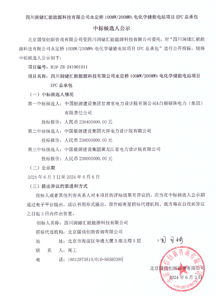 据储能界了解到,6月3日,四川润储汇能能源科技有限公司永定桥100MW/200MWh电化学储能电站项目EPC总承包候选人公示。