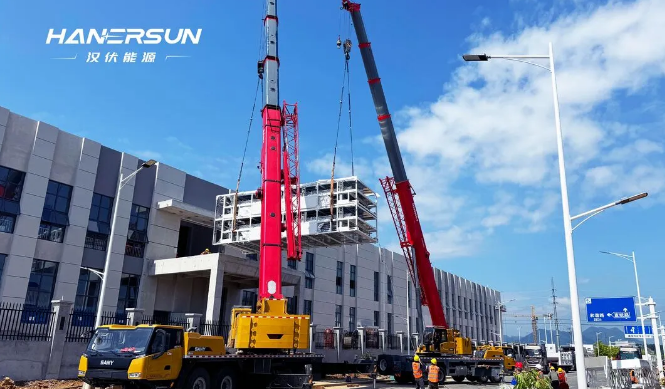 在当地政府的全力支持下,自2023年8月开工以来,汉伏能源光储基地经过9个月紧锣密鼓的施工,终于在初夏迎来了设备进场的重要节点。制造基地共分两期,全面投产后将形成电池2GW、组件5GW、储能组装线1GWh的产能规模。通过三线并行的高效生产模式,扩大生产规模,进一步保障了汉伏能源在业内的领先优势,满足全球客户需求。同时,该基地也将成为泾县低碳足迹绿色工厂的新标杆,推动当地绿色经济发展。