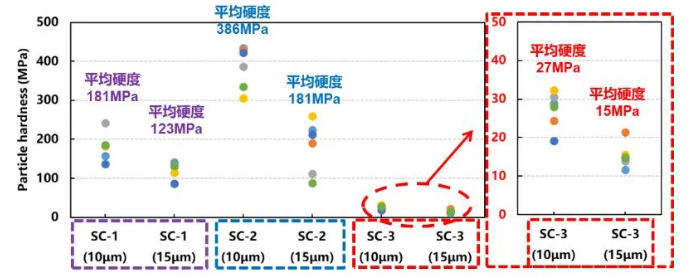 图5.硅碳材料不同粒径单颗粒硬度对比