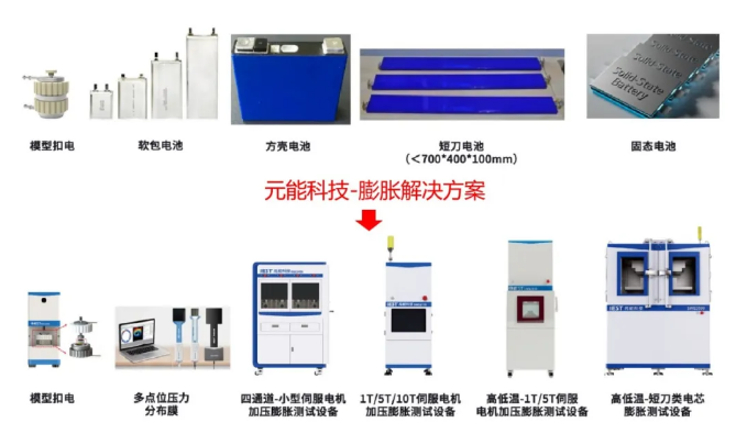 行业内的研究人员更加关注固态电池膨胀性能。客户可通过元能科技的SWE系列膨胀仪器,测试电池在不同温度与不同预紧力下的膨胀表现情况。SWE系列仪器具备多种测试模式,可研发人员进行不同实际工况的模拟测试,筛选最佳测试条件。其测试应用方向包括不同材料碰撞评估、原位析锂窗口预估、电芯寿命预估等到方向。搭配BPD系列压力分布膜,可进行固态电池平面不同位置的膨胀评估,对固态电池电芯平整度有极好的评估能力。