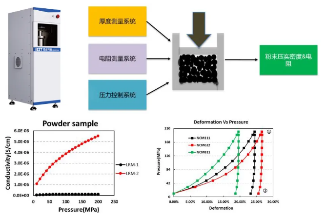对改性后的固态电池用正负极材料进行表征,可以采用测试材料压实以及电阻率的方法去初步评估材料的性能,从而可以快速判断改性的效果。元能科技针对材料压实和电阻率测试开发了PRCD和PCD系列产品。采用PRCD系列设备对正负极材料进行粉末导电性和压实密度的实时测试,可以评估材料改性的效果以及材料批次稳定性。
