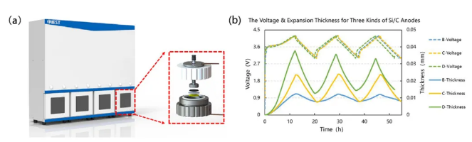 为方便研发人员快速对特殊结构设计的硅基材料进行膨胀对比评估,元能科技也推出了硅基负极膨胀原位快筛系统(RSS1400, IEST)。该设备利用模型扣电进行极片层级的原位膨胀测试,不仅操作方便,也极大节省了测试成本,将硅基材料膨胀评估的周期从原有的几十天缩短至1~2天。