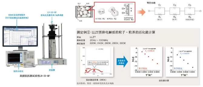 对氧化物或硫化物固态电解质进行阻抗测试时,可以理想地将样品的阻抗分为粒子单体阻抗,粒界(粒子之间)阻抗,电极界面阻抗三个成分。在对材料进行活化能特性分析时,可通过各个温度点的阻抗测定取得Arrhenius曲线,但是移动度高的粒子阻抗很小,用1MHz程度的频率无法取得粒子和粒界独立的阻抗谱数据。超高频阻抗测试系统可以在90K(-183℃)~873K(600℃)的宽广温度范围内实现高达100MHz的阻抗测试,通过本系统可以分离固态电解质等材料的粒子,粒界的阻抗值并进行独立的特性评价。