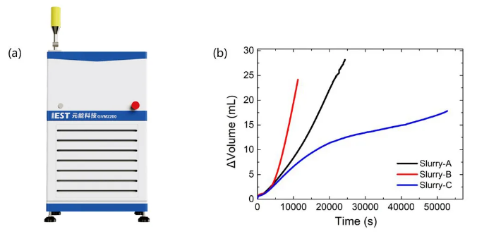 表面改性或元素掺杂等手段虽然可以有效降低硅基负极的膨胀,但这些改善工艺往往伴随着不稳定的因素,例如表面碱性和包覆不完整会导致纳米硅暴露出来,并在制浆过程中与氢氧根离子反应产气。此外,对氧化亚硅进行预镁或预锂化处理虽然可以提升氧化亚硅的首效,但同时也为氧化亚硅匀浆涂布过程带来了加工问题,比如匀浆产气、涂布掉料等。元能科技的原位产气体积监控仪(GVM2200,IEST)可对硅基负极浆料的产气行为进行实时、定量监控,其配备的高精度传感器可有效监测微小的产气变化(分辨度可达1μL),辅助研发人员揭示浆料产气机理,并制定有效的抑制措施。