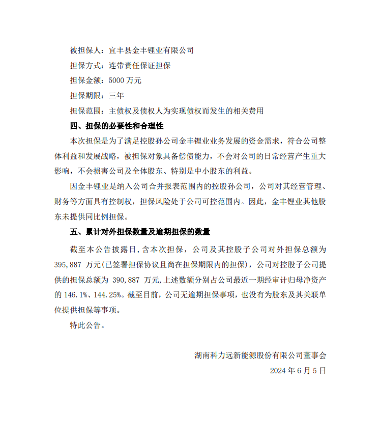 科力远表示,本次担保是为了满足控股孙公司金丰锂业业务发展的资金需求,符合公司整体利益和发展战略,被担保对象具备偿债能力,不会对公司的日常经营产生重大影响,不会损害公司及全体股东、特别是中小股东的利益。