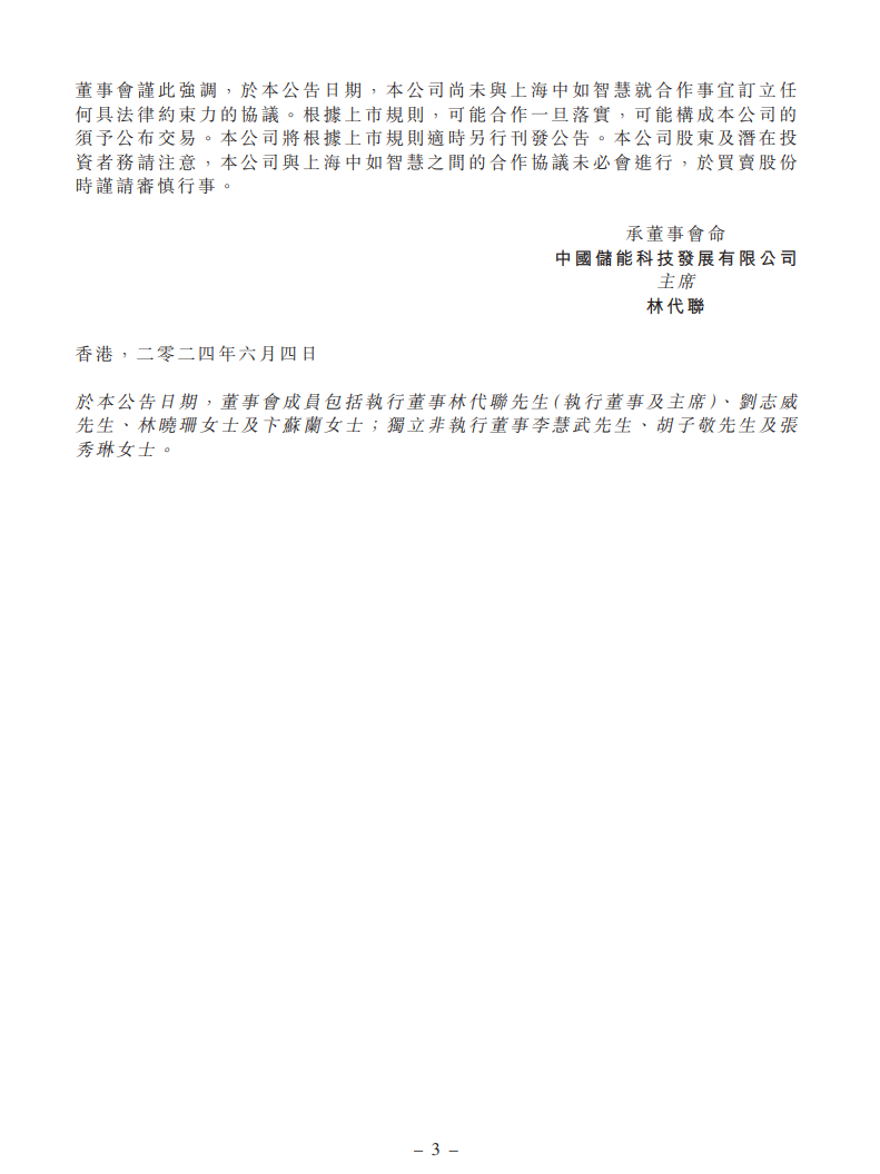 据储能界了解到,6月4日,中国储能科技发展发布公告称,公司与上海中如智慧能源集团有限公司订立不具法律约束的战略合作协议。