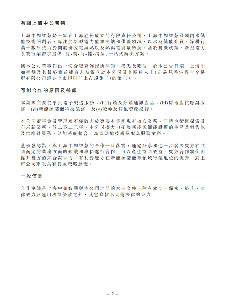 根据合作协议,公司与上海中如智慧拟成立一家合资公司。合资公司致力于在新能源储能等领域,合资公司的投资将不超过5千万港元。