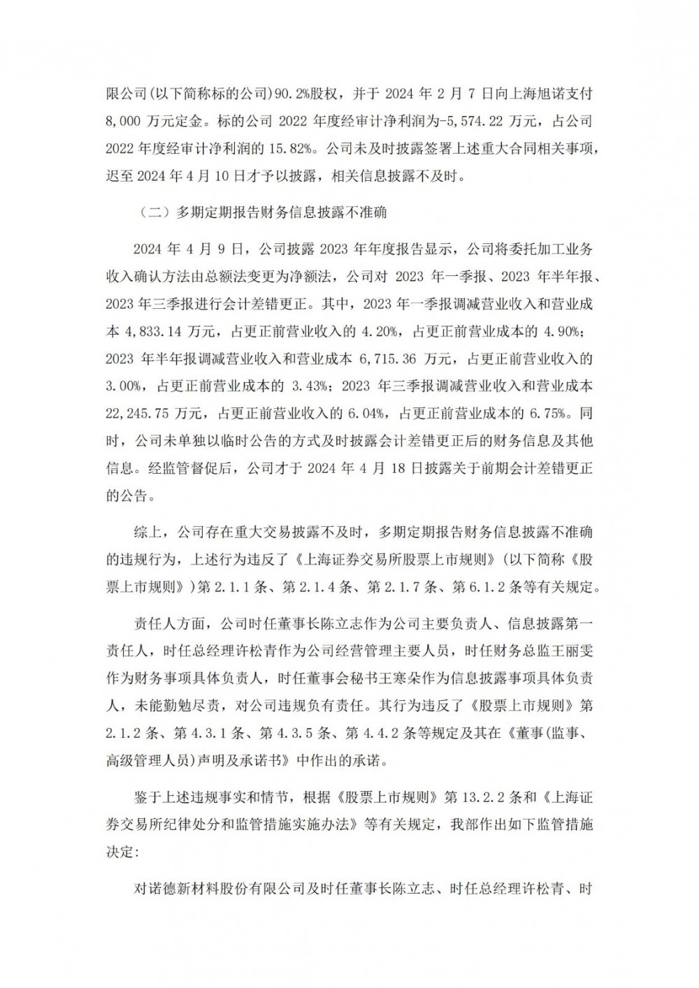 鉴于上述违规事实和情节,根据有关规定,上交所决定对诺德股份及时任董事长陈立志、时任总经理许松青、时任财务总监王丽雯、时任董事会秘书王寒朵予以监管警示。