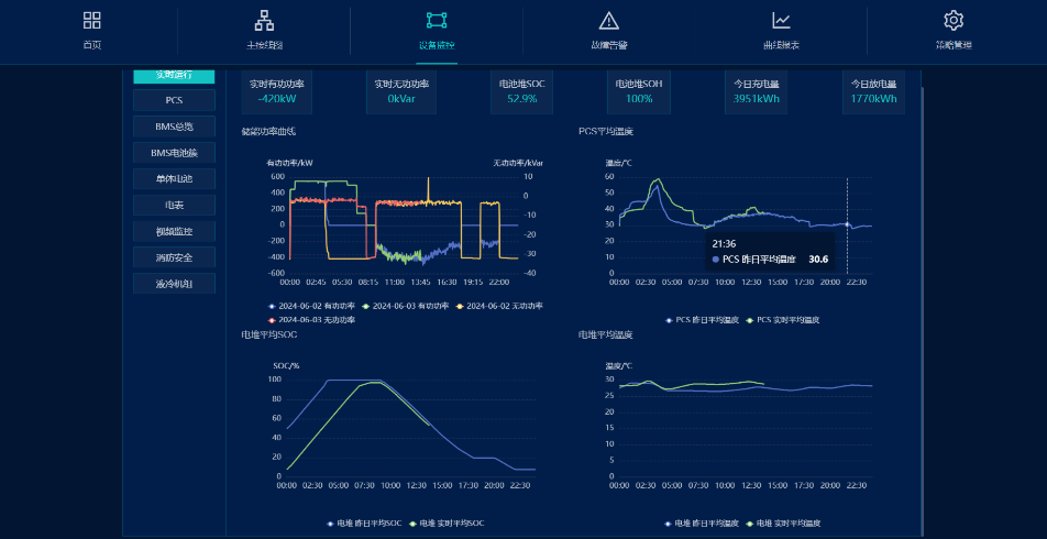 设备监控界面:本界面为首页检测系统运行的拓展,可多方面展示系统实时运行数据;根据左侧不同的选项,可实时查看系统内每一台PCS、BMS、液冷机组运行状况,监控深度直达单体电芯。