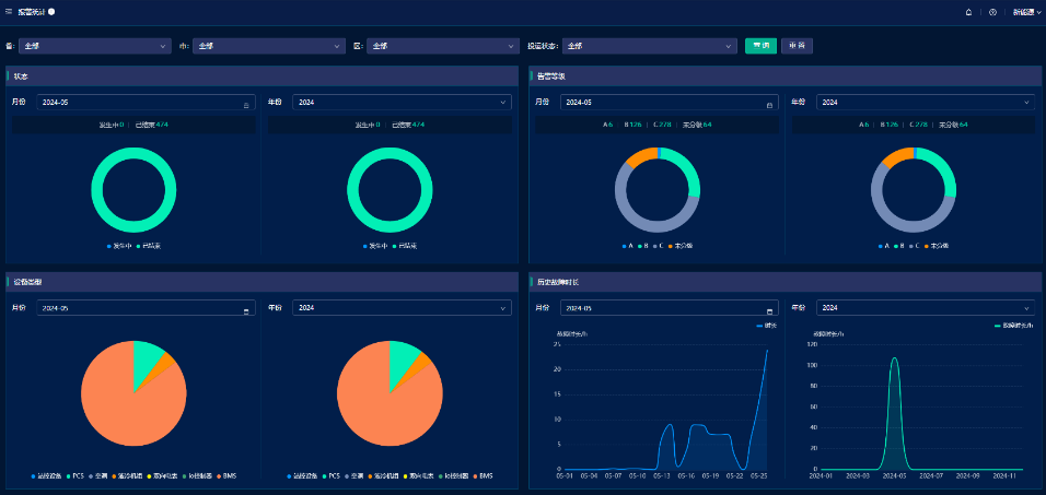 曲线报表界面:本界面为首页数据监测的拓展,可以全方面、多维度的展示全系统实时的和历史的运行数据,可自行生成图表,支持自定义图表数据,方便快捷。