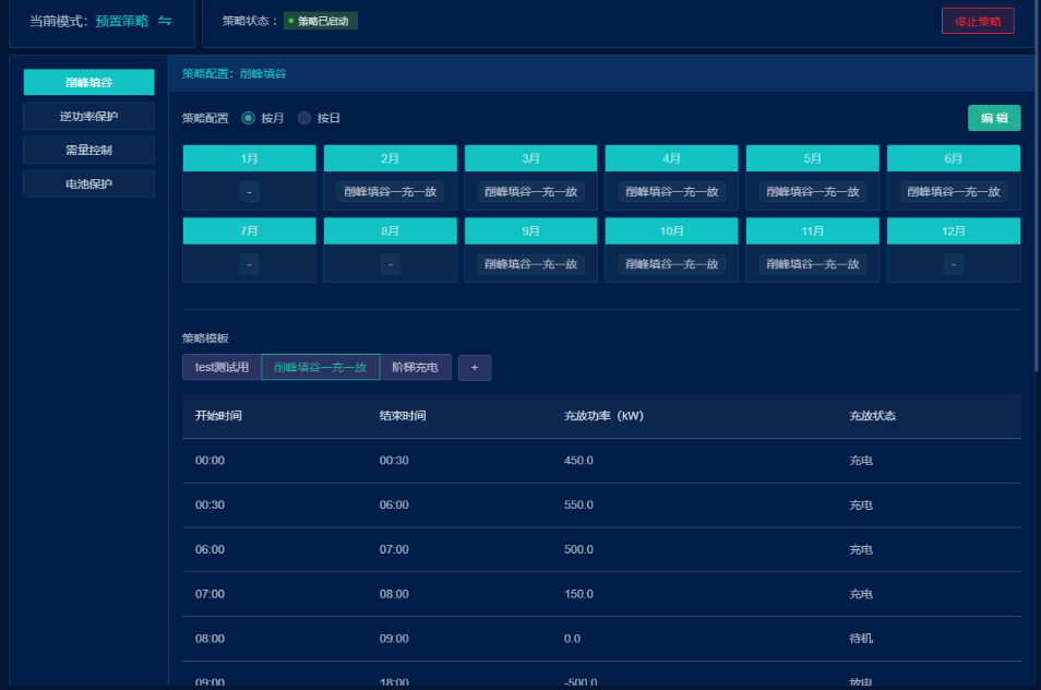 策略管理界面:根据用户需要,可分年、月、日;可分时段定制化运行策略,充分满足用户需求;同时设立保护机制,保护用户设备稳定运行。