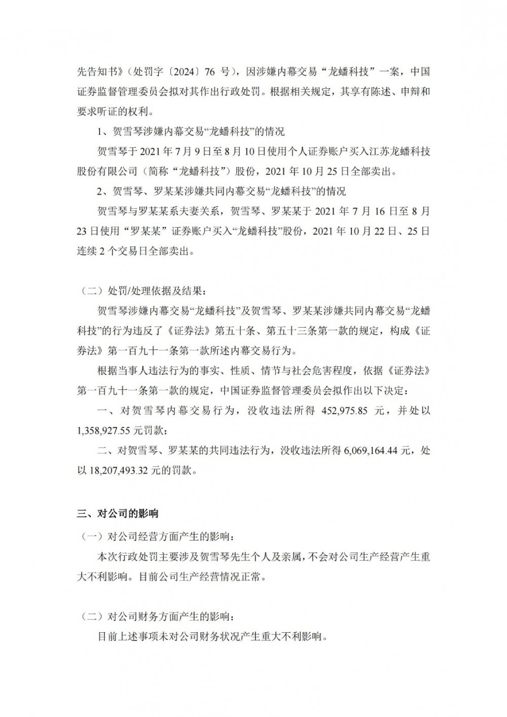 贺雪琴、罗某某涉嫌共同内幕交易“龙蟠科技”的情况贺雪琴与罗某某系夫妻关系,贺雪琴、罗某某于2021年7月16日至8月23日使用“罗某某”证券账户买入“龙蟠科技”股份,2021年10月22日、25日连续2个交易日全部卖出。