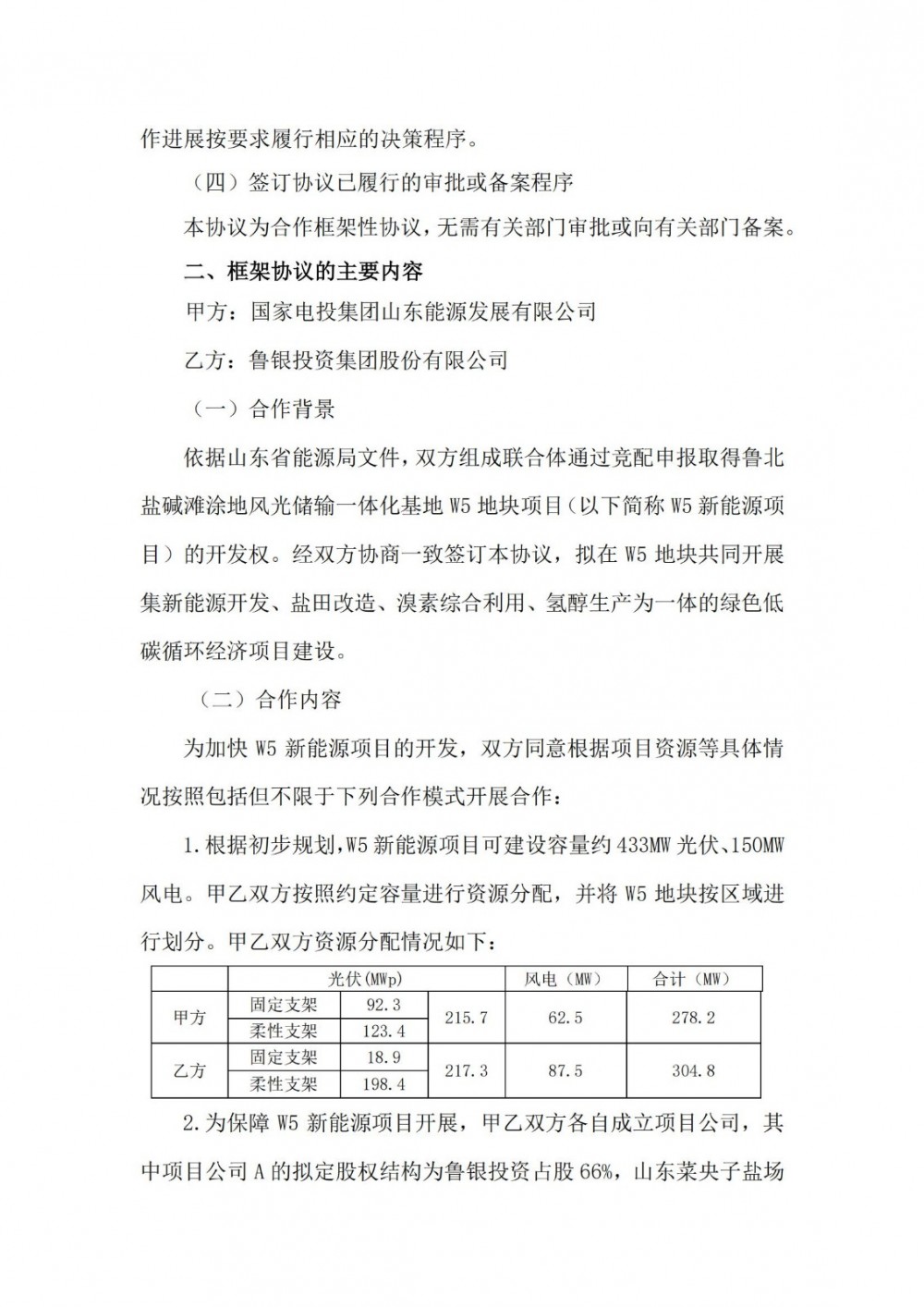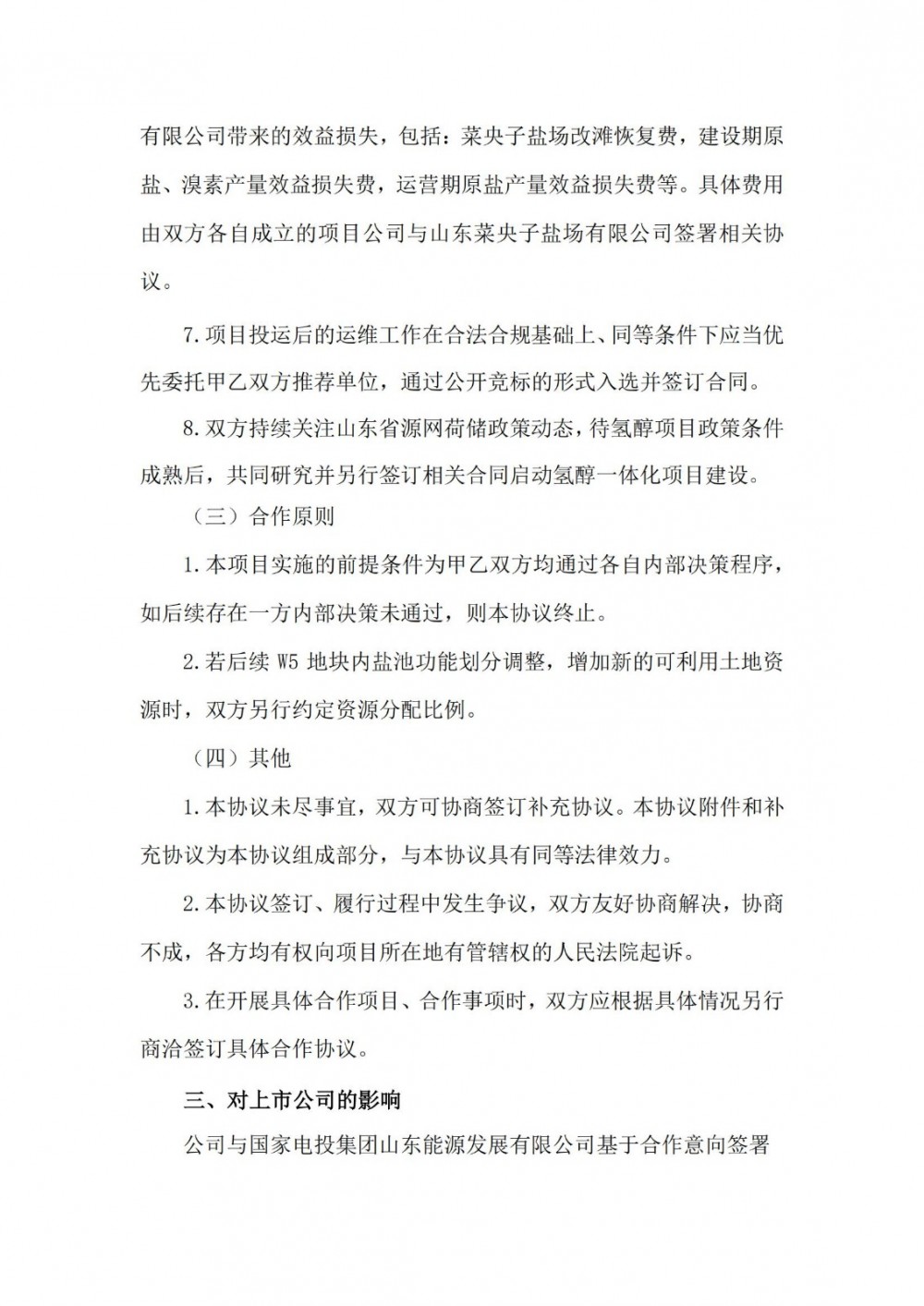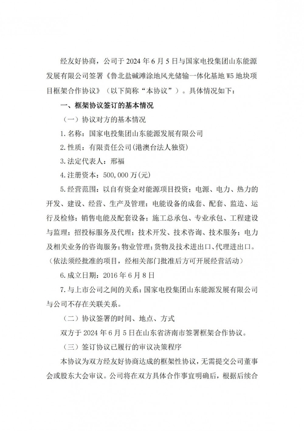 依据山东省能源局文件,双方组成联合体通过竞配申报取得鲁北盐碱滩涂地风光储输一体化基地W5地块项目(以下简称W5新能源项目)的开发权。经双方协商一致签订本协议,拟在W5地块共同开展集新能源开发、盐田改造、溴素综合利用、氢醇生产为一体的绿色低碳循环经济项目建设。