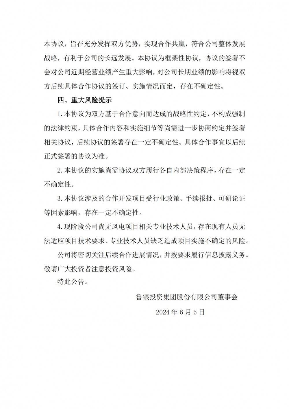 鲁银投资表示,公司与国家电投集团山东能源发展有限公司基于合作意向签署本协议,旨在充分发挥双方优势,实现合作共赢,符合公司整体发展战略,有利于公司的长远发展。本协议为框架性协议,协议的签署不会对公司近期经营业绩产生重大影响,对公司长期业绩的影响将视双方后续具体合作协议的签订、实施情况而定,存在不确定性。