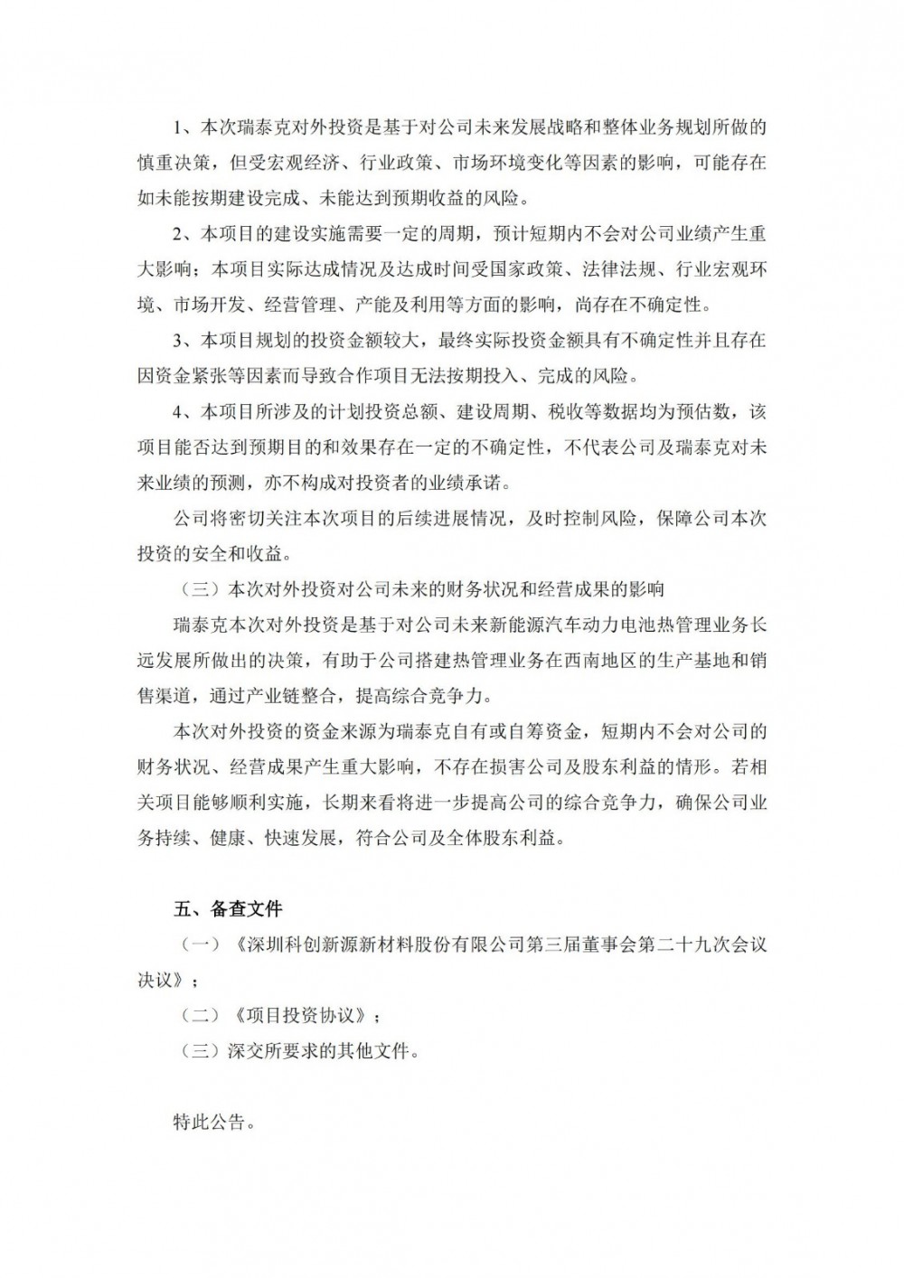 瑞泰克本次对外投资是基于对科创新源未来新能源汽车动力电池热管理业务长远发展所做出的决策,有助于公司搭建热管理业务在西南地区的生产基地和销售渠道,通过产业链整合,提高综合竞争力。