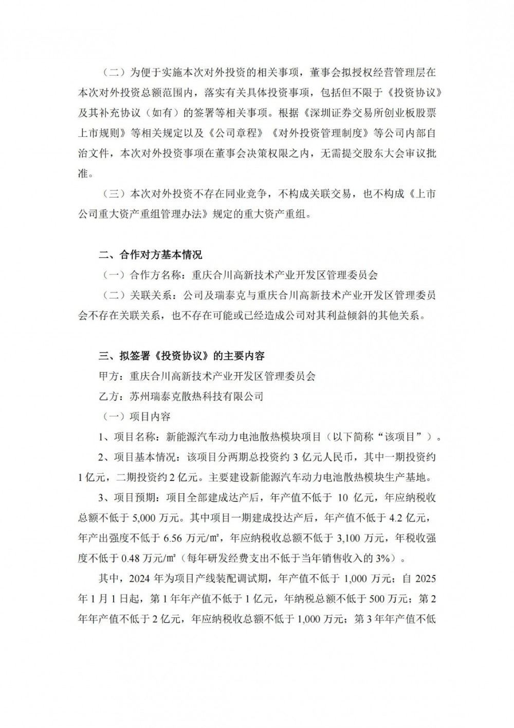 据储能界了解到,6月5日,科创新源发布公告称,为了进一步整合产业链,扩大公司生产基地和销售渠道,科创新源子公司瑞泰克拟与重庆合川高新技术产业开发区管理委员会签署《项目投资协议》。瑞泰克拟以总投资额30,000万元人民币在重庆合川高新技术产业开发区建设新能源汽车动力电池散热模块生产基地(全文简称“本次对外投资”)。
