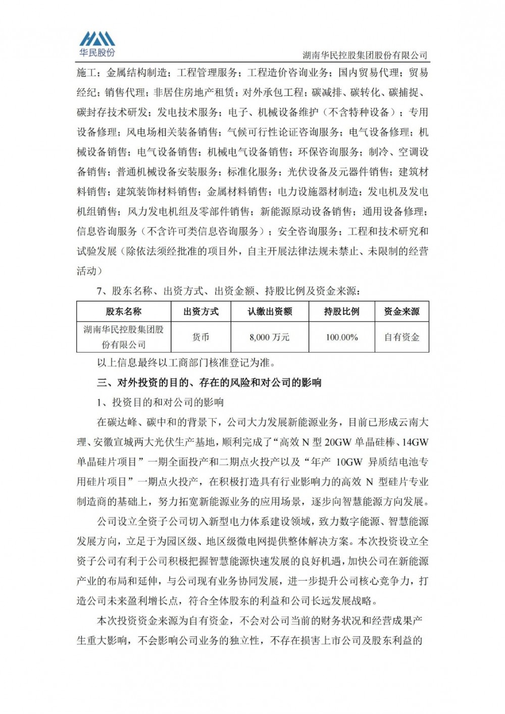 据储能界了解到,6月5日,华民股份发布公告称,为进一步拓展公司在新能源领域的业务布局,公司拟投资设立全资子公司湖南鸿宇智慧新能源开发有限公司,注册资本8000万元。公司设立全资子公司切入新型电力体系建设领域,致力数字能源、智慧能源发展方向,立足于为园区级、地区级微电网提供整体解决方案。