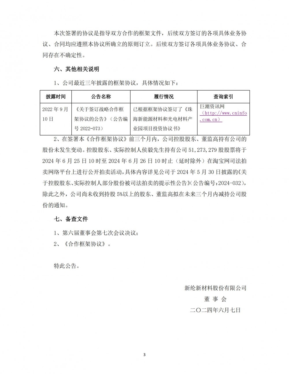 ST新纶表示,本协议的签订,继续深化了公司与格力集团的合作,在前期双方共同打造新能源电池材料和光电材料产业园的基础上,充分利用双方的优势,在加快产能落地、重整化债、企业纾困、产业投资等方面进一步加强合作,后续公司将在本《合作框架协议》的基础上与协议对方具体磋商并签订相应项目的合作协议,以确保项目的最终实施。该协议的签订不会对公司本年度的业绩产生重大影响。公司将根据项目进展情况,及时履行信息披露义务。