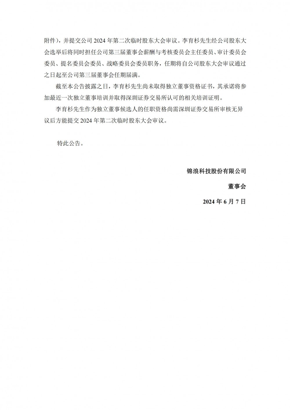锦浪科技为为董事会正常运作,同意提名李育杉为第三届董事会独立董事候选人。