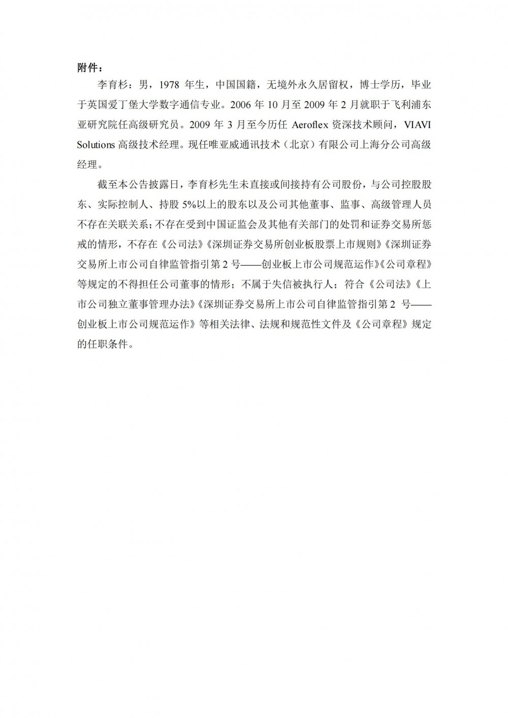 李育杉:男,1978年生,中国国籍,无境外永久居留权,博士学历,毕业于英国爱丁堡大学数字通信专业。2006年10月至2009年2月就职于飞利浦东亚研究院任高级研究员。2009年3月至今历任Aeroflex资深技术顾问,VIAVISolutions高级技术经理。现任唯亚威通讯技术(北京)有限公司上海分公司高级经理。