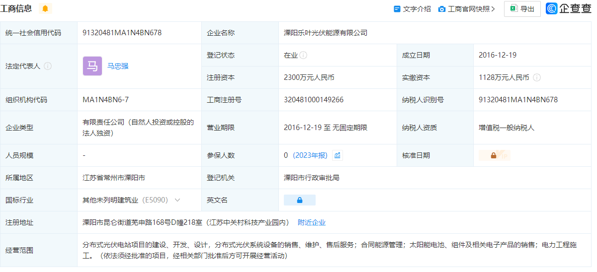 溧阳乐叶光伏能源有限公司成立于2016年12月,注册资本2300万元,经营范围为分布式光伏电站项目的建设、开发、设计,分布式光伏系统设备的销售、维护、售后服务,合同能源管理,太阳能电池、组件及相关电子产品的销售,电力工程施工。