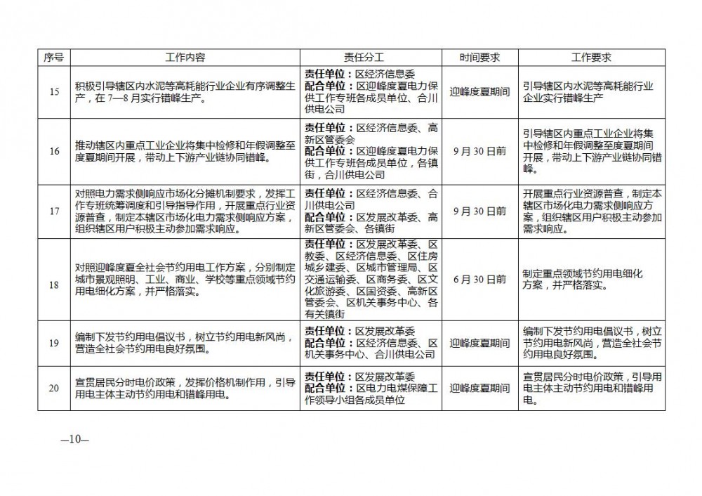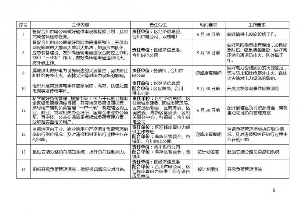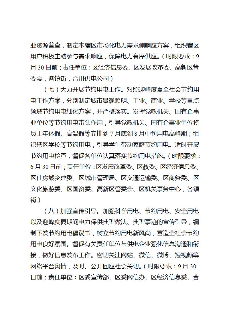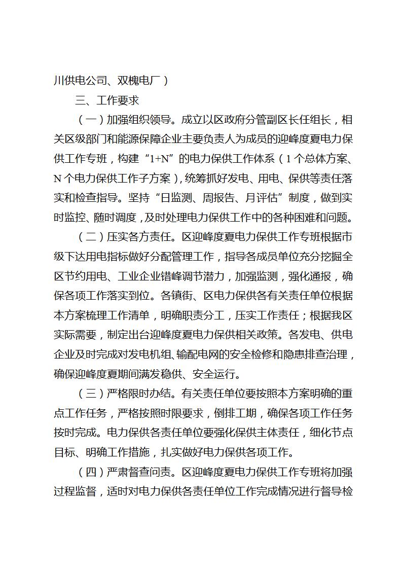 文件明确,做好电力运行调度。严格落实市迎峰度夏电力保供工作任务,分解细化迎峰度夏电力保供工作方案,压实各级责任,“清单化、责任制”推进全区迎峰度夏电力保供工作,切实保障电力保供各项工作任务落地落实。配合做好“水风光”电源点的水情、雨情、水库运行、防汛等相关服务保供工作,协助做好清洁能源的全市统筹调度工作,确保迎峰度夏期间“水风光”顶峰出力。