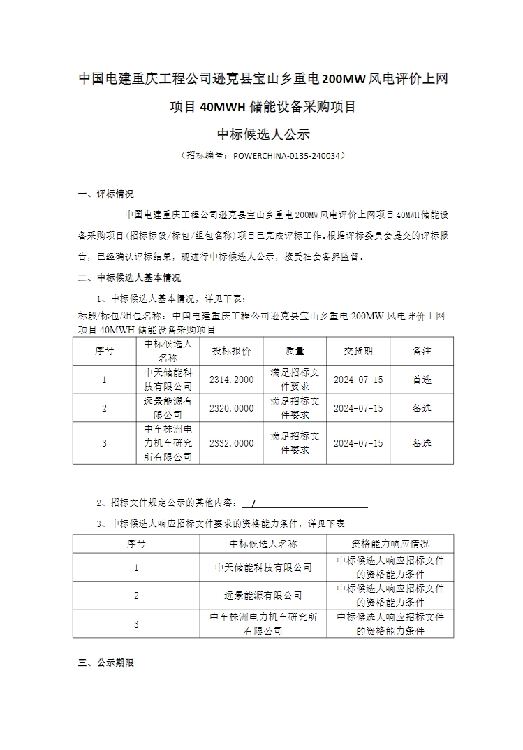 第一中标候选人为中天储能科技有限公司,投标报价为2314.2万元,折合单价0.579元/Wh;第二中标候选人为远景能源有限公司,投标报价为2320万元,折合单价0.58元/Wh;第三中标候选人为中车株洲电力机车研究所有限公司,投标报价为2332万元,折合单价0.583元/Wh。